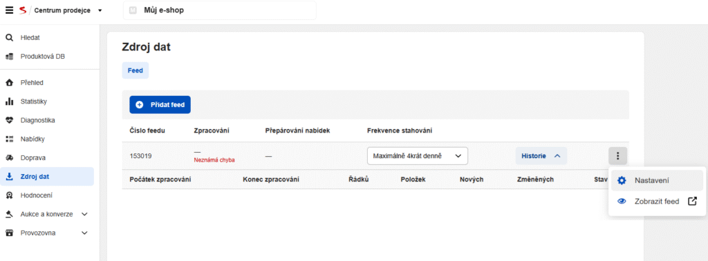 Změnu, úpravu, aktualizaci XML feedu provedete v administračním rozhraní Centrum prodejce v záložce „Zdroj dat“ – skrze tři tečky „Nastavení“.