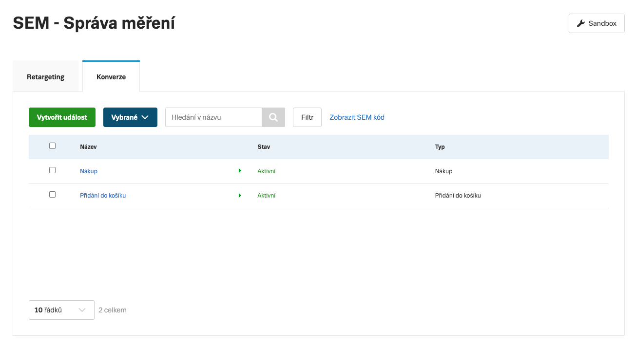 | Počet skriptů | Retargetingový + konverzní kód zvlášť | Jeden SEM skript pro všechny události |