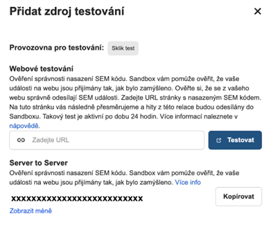 Pro zahájení testování klikněte na tlačítko „Začít testovat„. Otevře se modální okno s výběrem webového testování a S2S testování. Volba typu testování závisí na implementaci SEM měření.