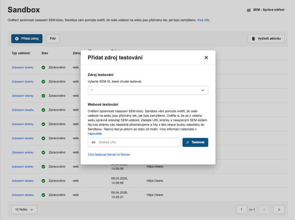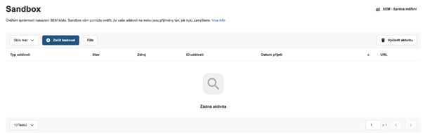 Sandbox je testovací nástroj ve Správě měření, který vám umožní ověřit správnost nasazení SEM kódu ještě před ostrým provozem – bez ovlivnění reálných dat.