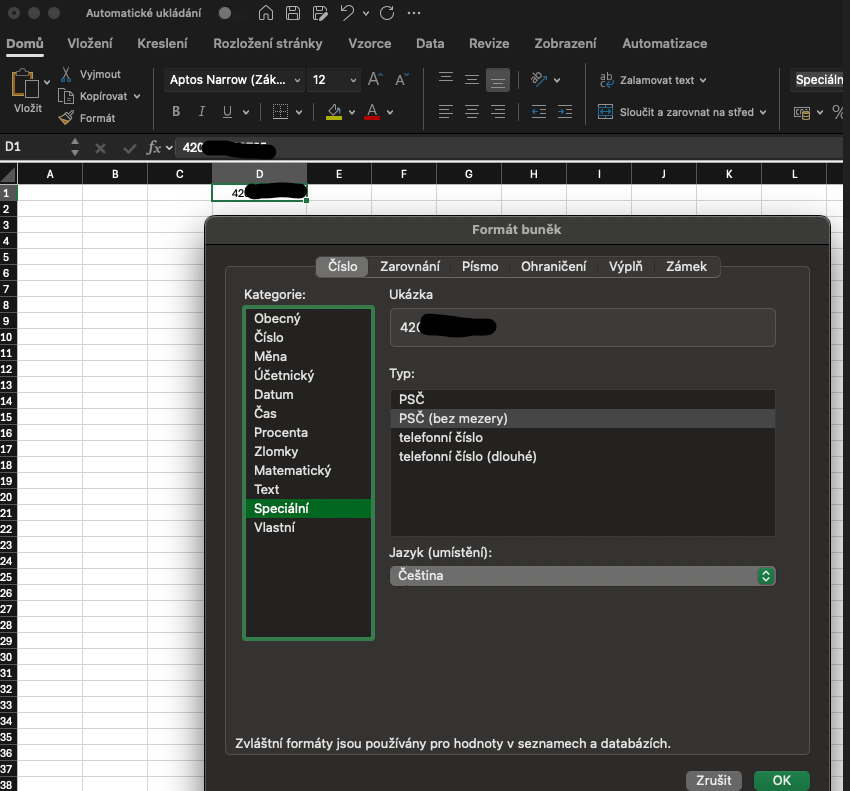 Obsahují-li vaše kampaně rozšíření o telefonní číslo (Click2Call), je v Microsoft Excel zapotřebí změnit formát příslušné buňky z Obecný na Speciální + typ (PSČ bez mezer):