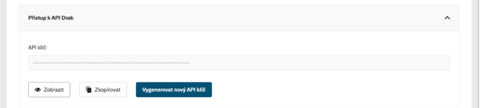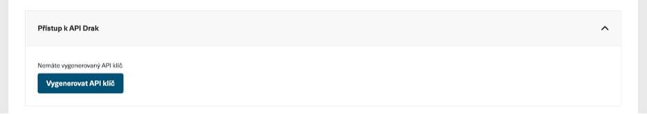 V Nastavení účtu běžte do sekce “Přístup k API Drak”. Zde si vygenerujte svůj první API klíč, který slouží pro interakci s API Drak.