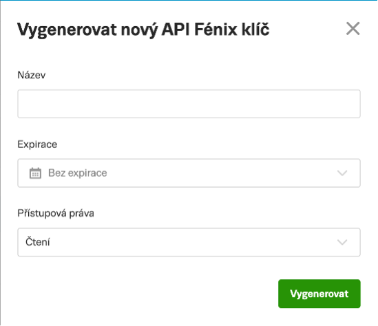 API Fénix podporuje více API klíčů s podrobným nastavením. U každého klíče můžete určit název, datum vypršení platnosti a přístupová práva. Díky tomu máte nad správou účtu větší kontrolu.