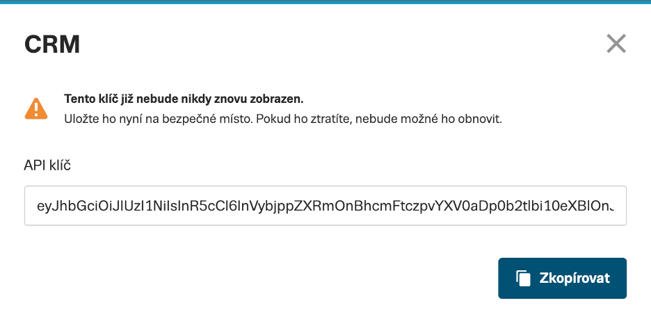 Po úspěšném vygenerování API klíče se zobrazí jeho hodnota. Uložte si ho na bezpečné místo. Později už nebude možné API klíč znovu zobrazit, stejně jako je tomu u API Drak.