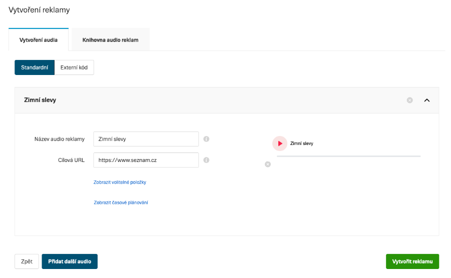 Pro vytvoření video reklamy stačí přes webové rozhraní Skliku nahrát podporovaný audio soubor, nebo vyberte dříve nahraný z knihovny reklam a nakonec zadejte Cílovou URL.